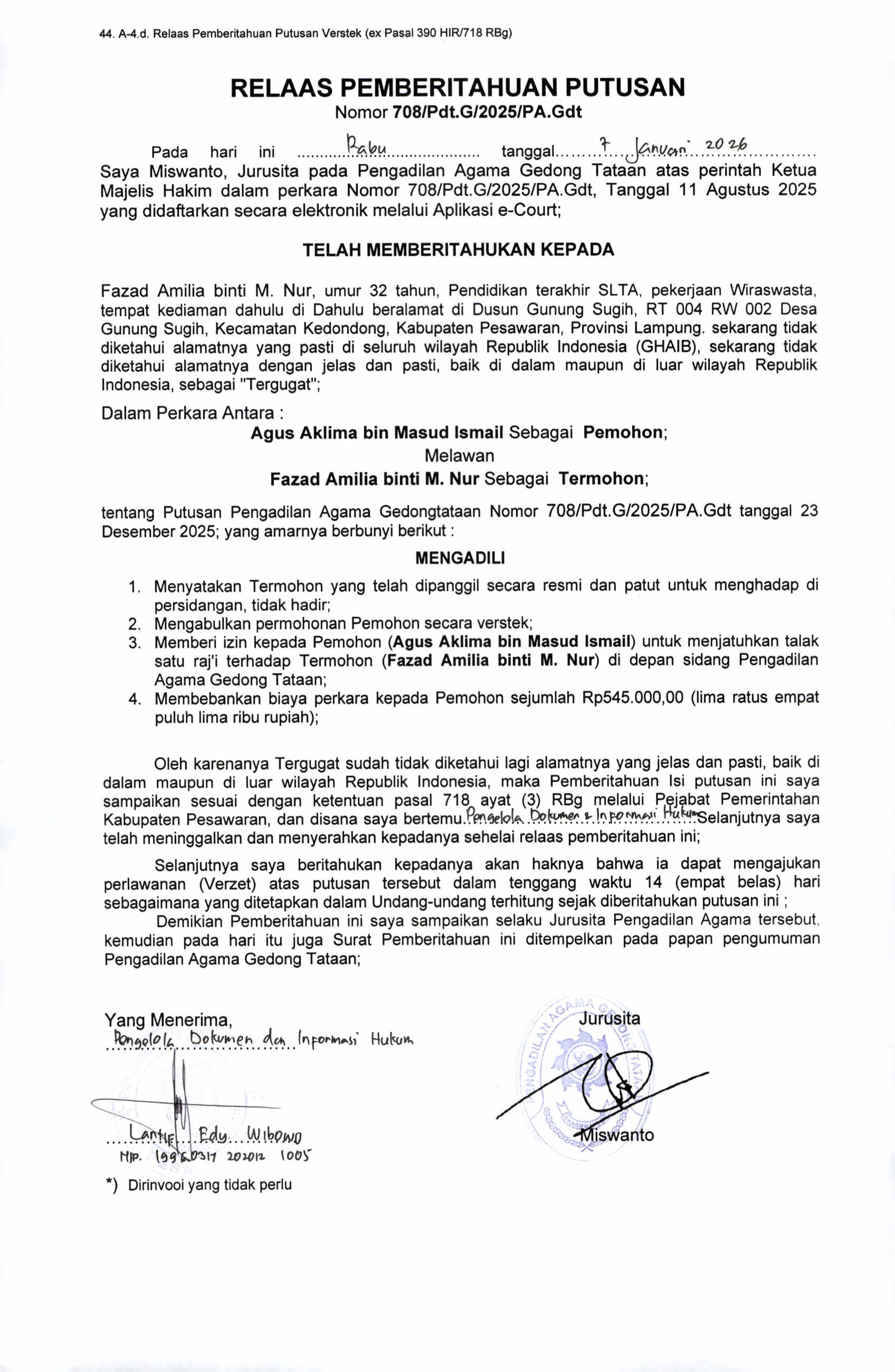 Pemberitahuan Putusan Verstek Perkara Nomor 708/Pdt.G/2025/PA.Gdt