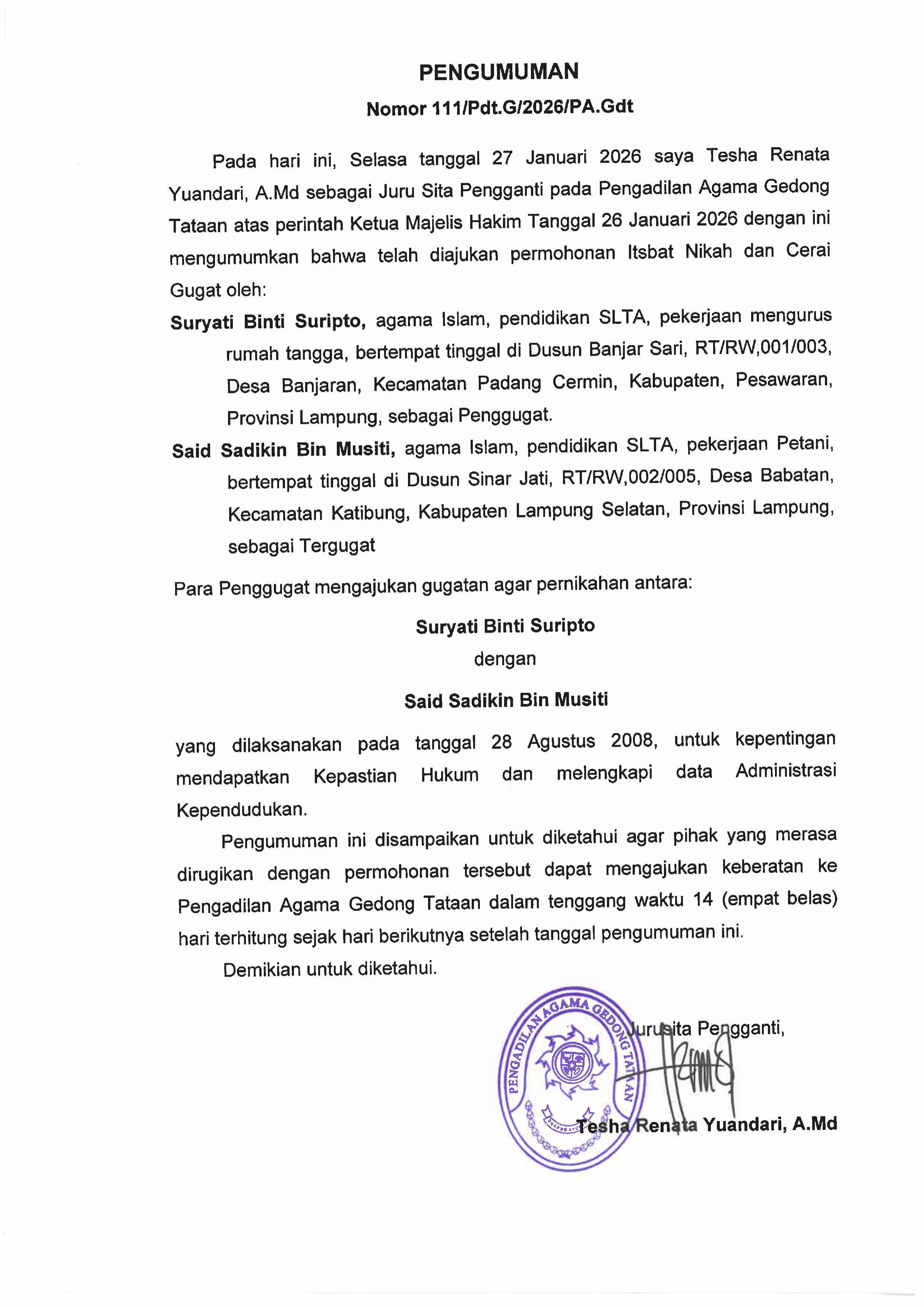 Pengumuman Itsbat Nikah & Cerai Gugat Perkara Nomor 111/Pdt.G/2026/PA.Gdt